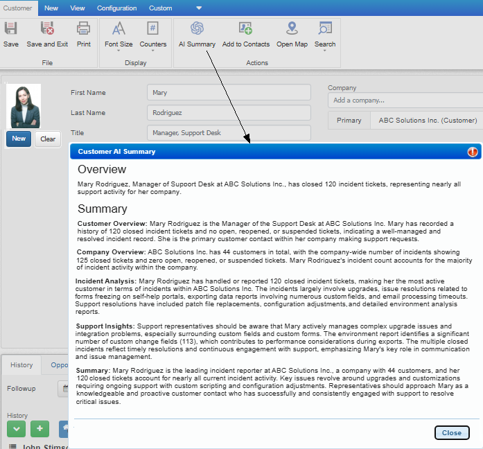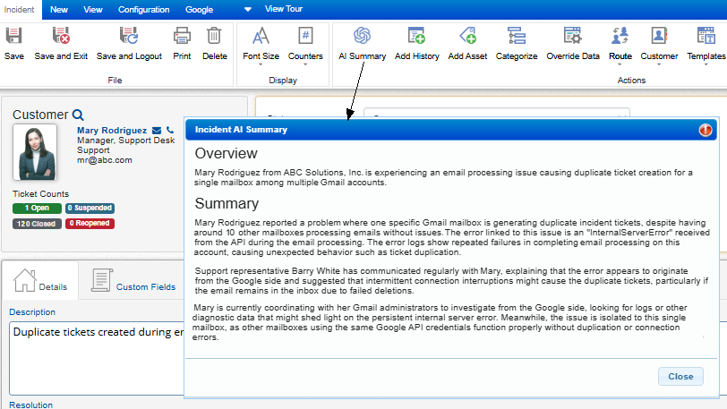 For incidents, correspondence, and customer profiles, your reps can use AI functionality to generate a one-sentence overview and summary that synthesizes customer and company background and incident history, regardless of company size and incident count, with one click. Reps can use this information to get up to speed quickly and efficiently, and incorporate any applicable information into their incident troubleshooting and resolution.