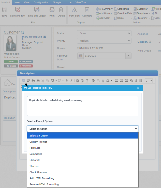 Throughout the product, reps can access an AI Editor with customizable prompts for actions such as fixing grammar, elaborating, shortening text, and more. Administrators and reps can also create new custom prompts.